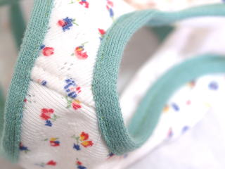 首まわり、袖まわりのトリミングテープは
