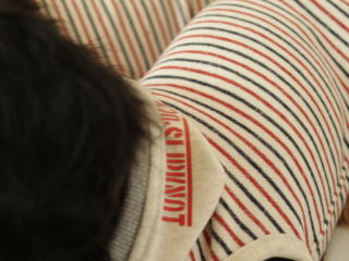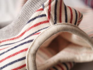 ★裾リブ部分はめくり上がらないよう、少し内に締まるように縫製しています。
